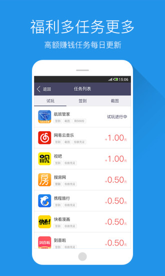 赚客安卓版 分类:安卓赚钱 大小:1.2MB 开发者:珠海蜂巢网络科技有限公司下载次数:3256最新版本:1.5热度: 作者: 发布: 2020-03-14 10:05:43 支持: Android2.3以上 Tags: 安卓下载 APP截图 应用介绍 赚客,一款让你轻松赚钱的手机APP,新用户安装送3元现金,任务量爆棚的平台,一个能赚8毛,15分钟赚20元,话费,现金10元可提现,24小时闪电到账!赚客每日抽奖秒领现金,实物大奖笔记本、平衡车、音响免费抽!开箱夺宝送iphone,游戏赚钱两不误! 最新应用 乐米资讯 淘金赚 猫猫赚 每天赚点 灵猴 小龙赚钱 蘑菇乐园 钱大师安卓版 泡泡赚 米赚