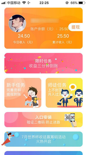 天天赚钱 分类:角色扮演 大小:11.9MB 开发者:武汉天天有量网络科技有限公司下载次数:3256最新版本:1.1.0热度: 作者: 发布: 2020-03-14 09:47:50 支持: 苹果手机 Tags: 安卓下载 APP截图 应用介绍 天天赚钱是苹果应用试玩平台,下载应用试玩就能赚钱的软件,单价1元左右,10元提现。每天大量任务,赚钱后可通过支付宝提现或话费充值,躺着赚钱轻松提现。 最新应用 i红包 天天赚钱 应用试客 多多红包 小鱼赚钱 芒果试玩 蝉试客 秒赚试玩 爱钱试玩